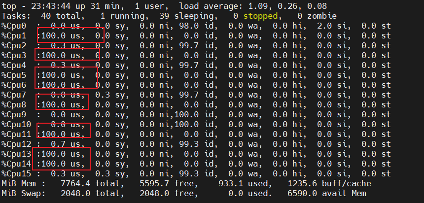 %Cpu6 : 93.7 us, 0.0 sy, 0.0 ni, 6.3 id, 0.0 wa, 0.0 hi, 0.0 si, 0.0 st