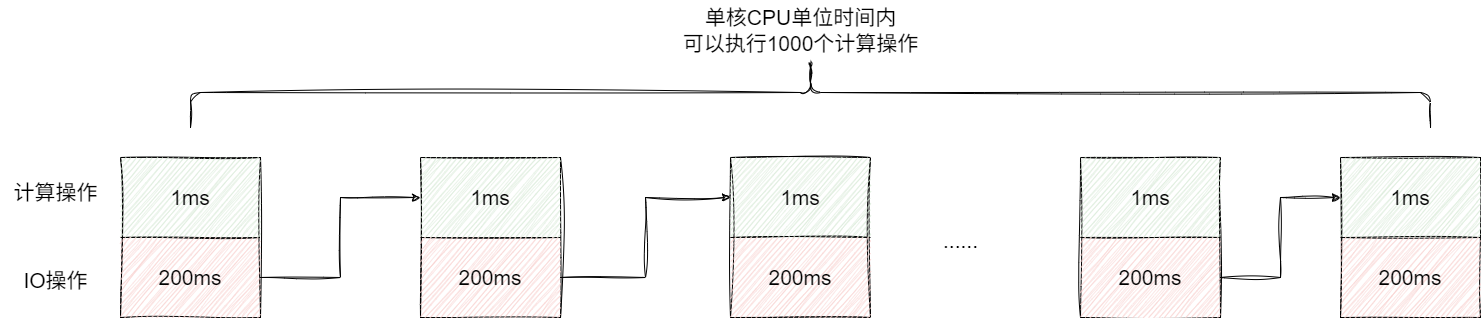 实际上(1+w/c)这个过程本质上就是在计算针对这个任务,在IO阻塞期间可以提前完成多少计算操作,按照我们的计算比来说每个任务都有200ms的IO阻塞,这也就意味着在200ms的阻塞期间,理想情况下(如果CPU全心全意只执行我们这个程序的任务),阻塞期间可以处理w/c也就是200个计算操作: