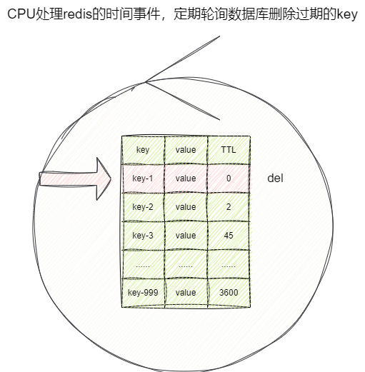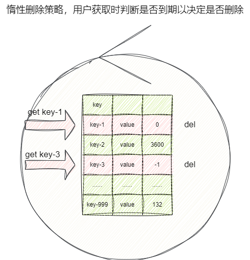 key到期了我们也不处理,等到用户通过get指令获取的时候判断即生存时间是否到期,如果到期则删除并返回null,反之返回查询结果。 - 定期删除:每隔一段时间,对数据库进行一次全量检查,批量删除到期的