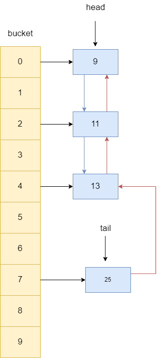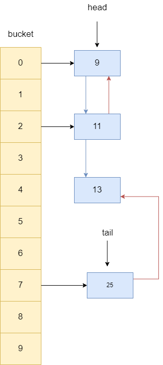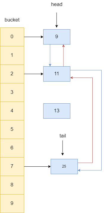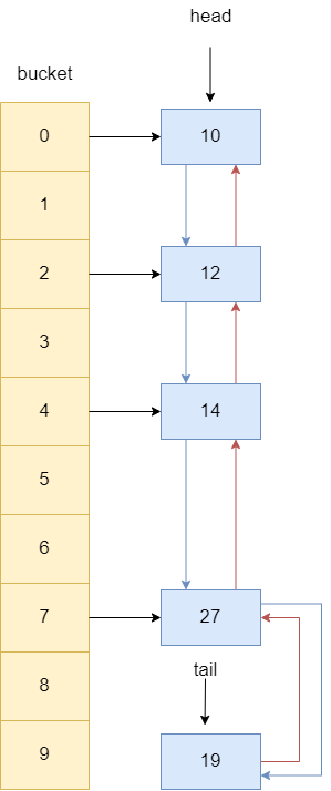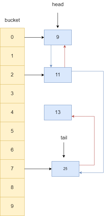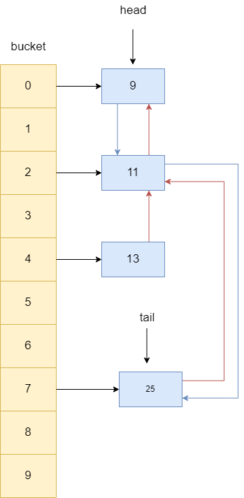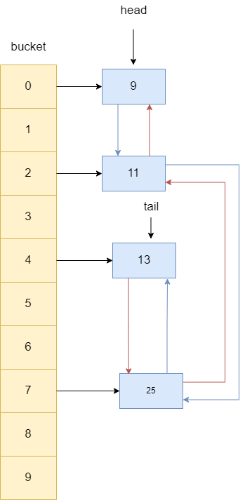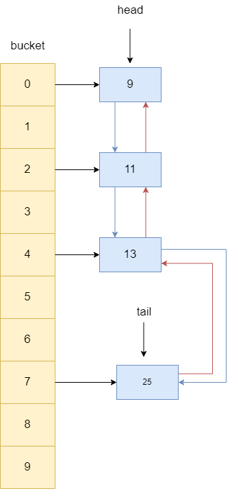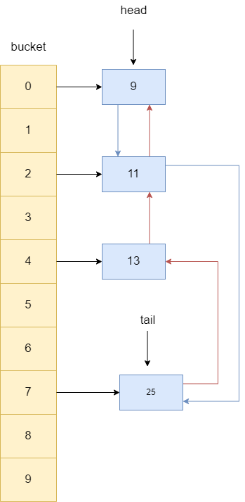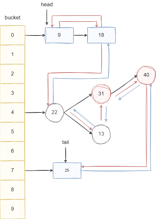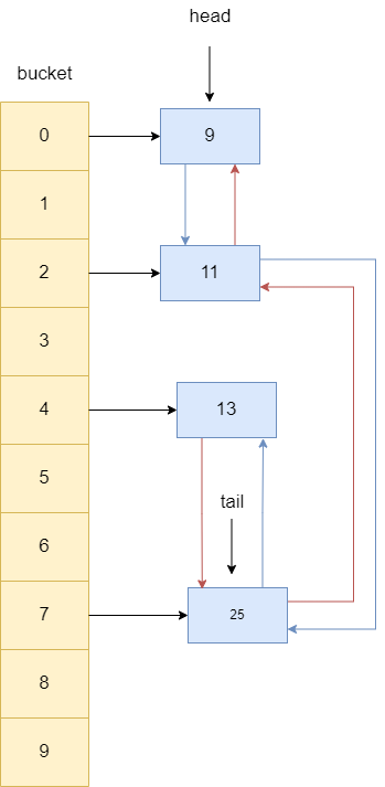 LinkedHashMap逻辑结构如下图所示,它是在HashMap基础上在各个节点之间维护一条双向链表,使得原本散列在不同bucket上的节点、链表、红黑树有序关联起来。