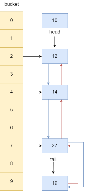以下图为例,假设笔者最后新插入了一个不存在的节点19,假设capacity为4,所以removeEldestEntry返回true,我们要将链表首节点移除。