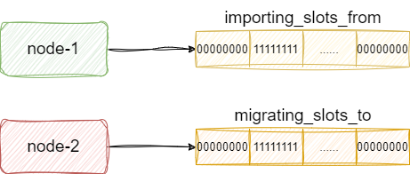 这两条指最终都会被各自的服务端解析,并调用clusterCommand执行,我们以节点1导入为例,假设我们执行clusterCommand解析到setslot 关键字和importing关键字,即知晓要导入其他节点的数据。对应的节点1就会通过importing_slots_from数组标记自己将导入这个slot的数据,而节点2也会通过migrating_slots_to数组标记自己要将数据导出给其他节点的slot: