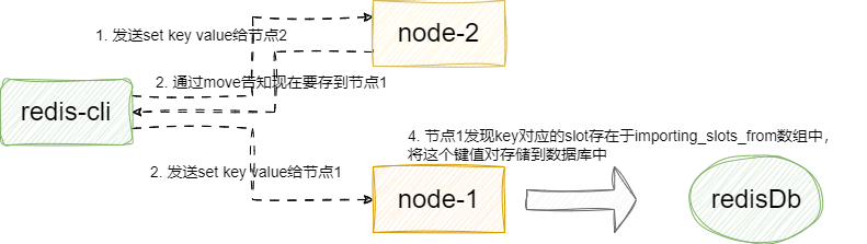 后续的我们假设还是将set key value请求发送到节点2,因为上述命令的原因,节点会返回move/ask告知客户端这个键值对现在要存到节点1上。对应节点1收到这个key请求时,通过key计算得slot正是自己,它就会将这个键值对存储到自己的数据库中: