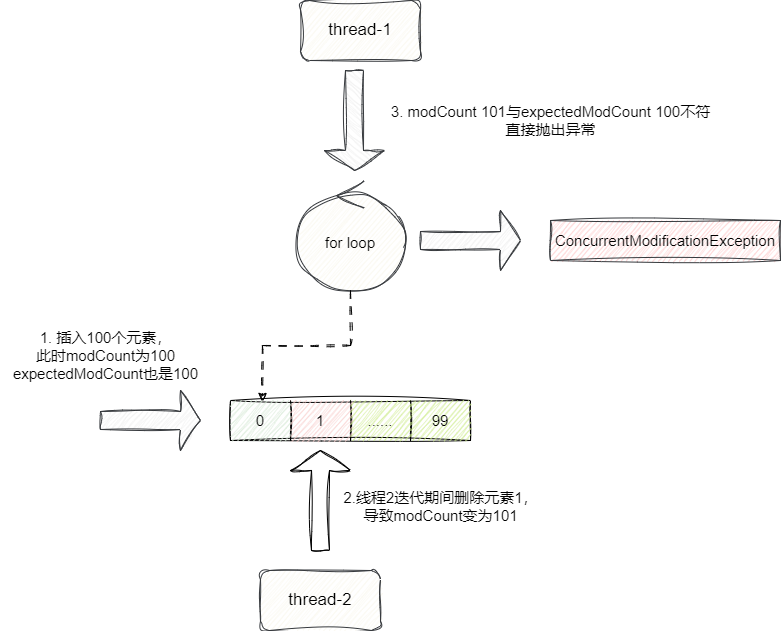 线程1在随后foreach第2轮循环发现modCount 为101,与预期的expectedModCount(值为100因为初始化插入了元素100个)不等,判定为并发操作异常,于是便快速失败,抛出ConcurrentModificationException: