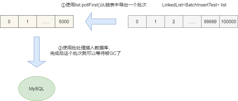 List<BatchInsertTest>转List<Object[]>时数组空间的占用,避免没必要的GC。 - 将查询结果用链表存储查询结果,通过分批弹出元素并进行插入,实现一个批次一个批次的插入,从而保证数据尽早被