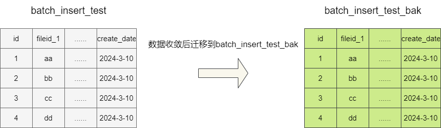 当前的需求会将上述数据表的数据按照某个业务规则进行汇总采集,然后存入batch_insert_test_bak,可以看到这张表除了表名以外,字段和上表是一致的。