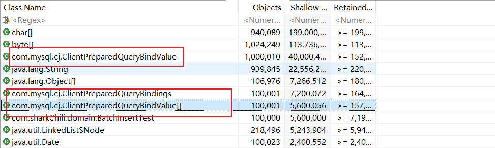 我们再次查看内存快照,结合日志可以猜出大概率是因为在插入那些List<Object[]> objects数组对象作为入参进行插入时生成MySQL相关映射对象导致了OOM: