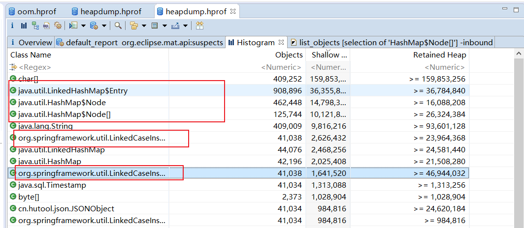 上述指令我们将内存快照存放到了F:\tmp\下,所以我们通过mat打开这个文件,可以看到大量的内存被HashMap相关的对象实例所占用:
