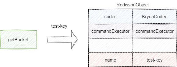 对于RBucket对象的set和get操作本质上都是基于redis字符串操作指令set和get的一层封装,在我们调用getBucket获取对应key的bucket的时候,redisson会基于当前客户端的连接信息和bucket键进行一次封装得到一个test-key的bucket对象: