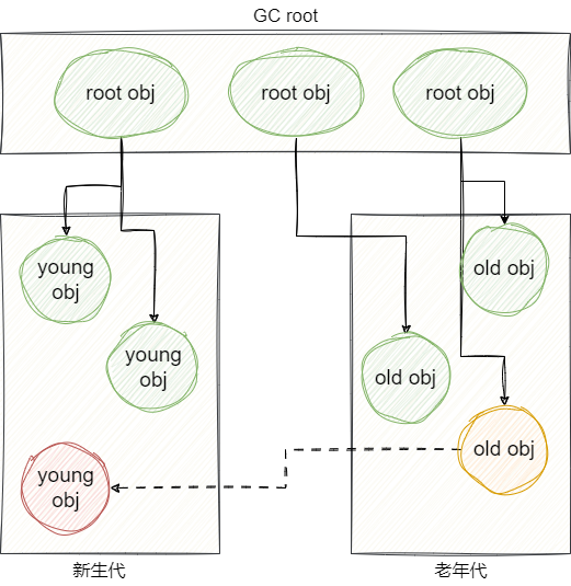我们都知道堆内存是分为新生代和老年代的,这就可能存在新生代持有老年代引用或者老年代持有新生代对象引用的问题,以下图为例,新生代进行gc时,因为感知不到老年代持有新生代引用的情况,而无故将新生代应该存活的对象给回收了: