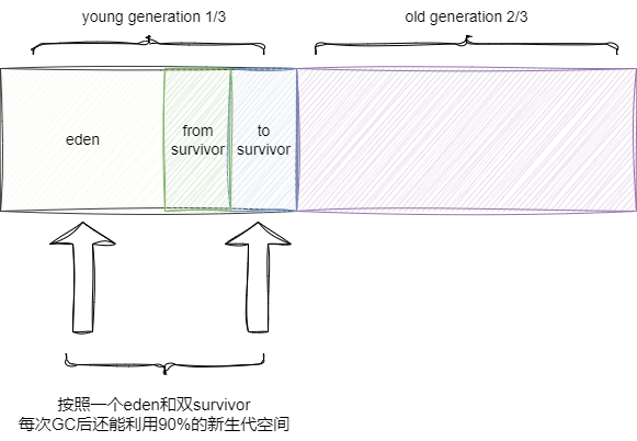 新生代一般来说GC次数要比老年代高很多,通常来说新生代我们考虑高效且空间利用率高,保证尽可能少的内存碎片,所以新生代采用标记复制法进行垃圾回收,将区域分为1个eden区和两个survivor区,当eden区满了之后就会触发minor gc,将存活的对象移动的另外一个survivor区中,由此保证空间利用率为90%且没有内存碎片。