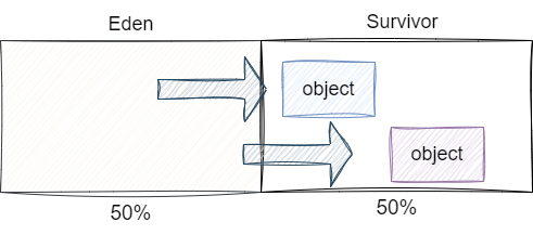 如果我们将配比改为1:1的话,每次GC后都只能将存活对象移动到另一半的新生代堆空间,使得空间利用率只有50%: