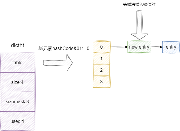dictEntry的后面,这也就是我们常说的链地址法。 used字段自增一下,表示当前哈希表有一个元素。