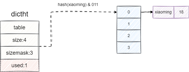 字典用table管理当前存储键值对的数组,这个数组的大小可有size这个字段知晓,每当我们有一个键值对要存储到字典时就会通过sizemask进行按位与运算得到table数组的某个索引位置将当前键值对存储,然后自增一个used标识当前有一个节点加入。