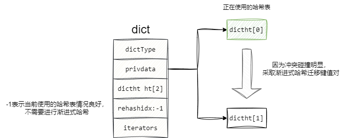如下图所示,可以看到dict的数据结构定义了大小为2的哈希表数组,当某个哈希表碰撞激烈需要进行调整时,就会采用渐进式哈希算法将键值对存到dictht[1],并通过rehashidx标志为-1表示当前处于渐进式哈希阶段: