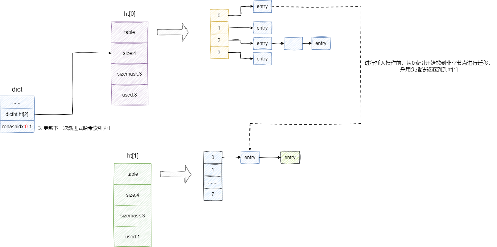 //used 为0说明所有元素驱逐完成,将ht[1]指向的哈希表赋值给ht[0],重置rehashidx ,并返回0