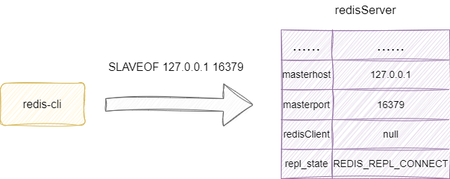 当我们通过Slaveof 指令设置当前节点为其他节点的从节点时,redis会解析这条指令并调用slaveofCommand,其内部会为redisServer配置主节点信息,并将状态更新为REDIS_REPL_CONNECT,意为待待建立连接: