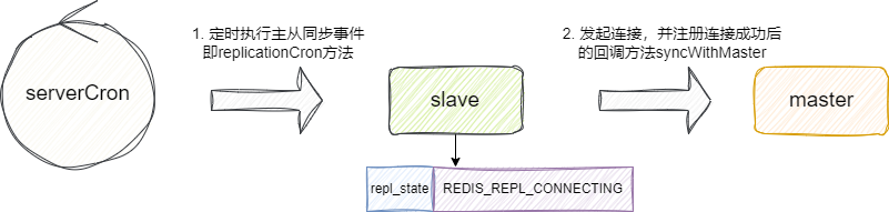 我们都知道redis会定期执行时间事件,所以每次执行定时任务的方法serverCron时,就会检查每隔1s执行一次replicationCron,其内部就会检查redis的状态是否是待连接,如果是则通过主库的ip及端口号信息发起连接,并在连接期间将状态设置为REDIS_REPL_CONNECTING: