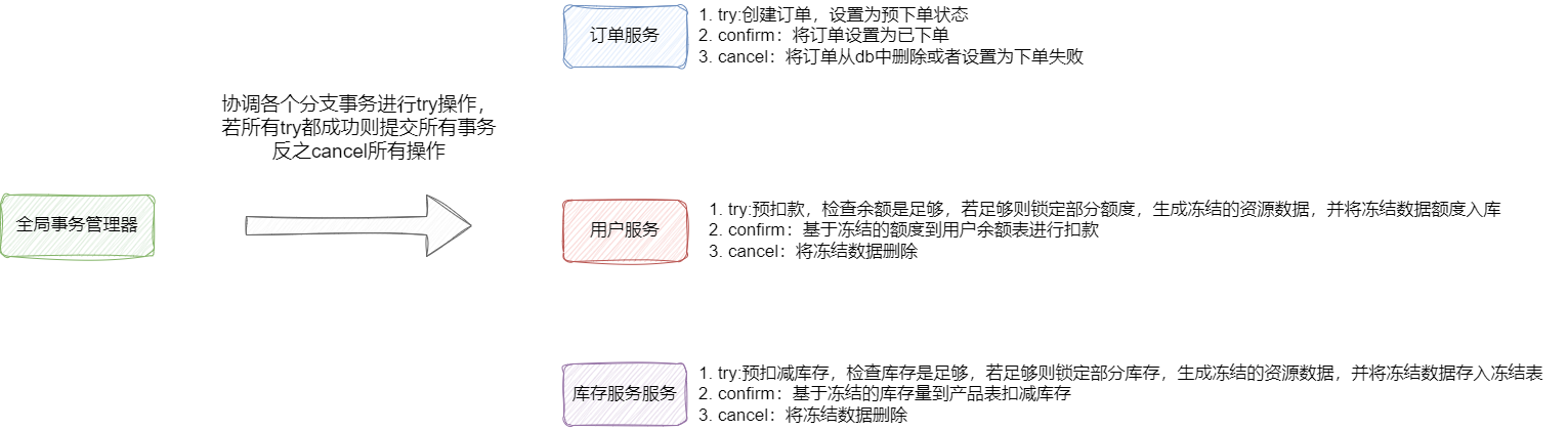 - 事务管理器告知每个事务执行try操作,订单服务创建预订单,将状态设置为预下单状态,用户服务锁定部分额度存入冻结资源表,库存服务同理,锁定数量库存到冻结表。