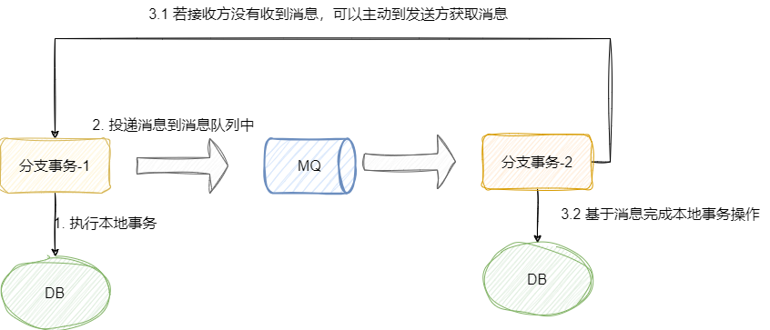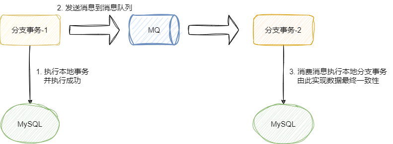- 分支事务-1执行本地事务操作,完成后通过RPC、HTTP、MQ同步或者异步发送消息告知其它事务执行自己的逻辑以保证业务的最终一致性。
