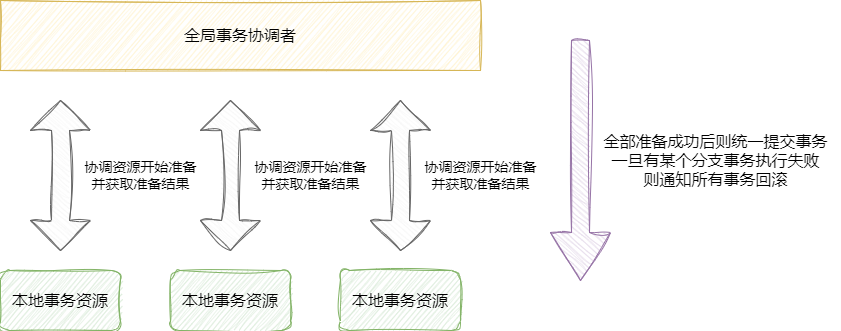 redo和undo日志,然后告知事务协调者准备完成。 - 二阶段事务协调者会基于各个分支事务准备结果进行进一步全局操作,假设所有分支事务都准备成功那么就通知所有分支事务提交,反之若有单个事务准备失败则通知所有事务回滚。