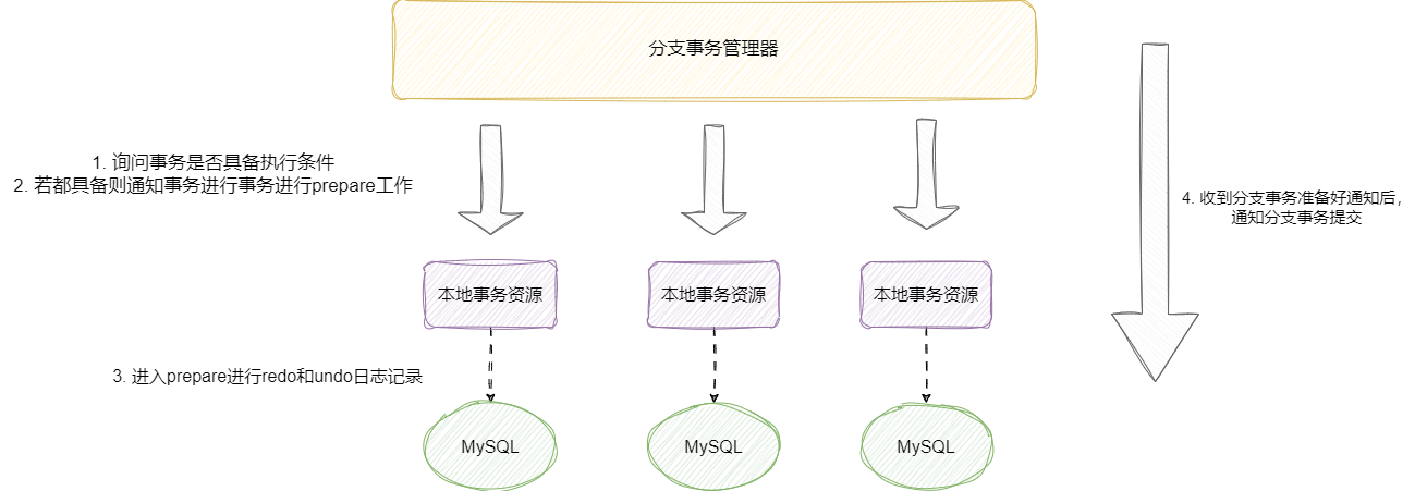 - 一阶段询问各个分支事务是否准备好,此时分支事务(假设是MySQL)就会准备好相应的