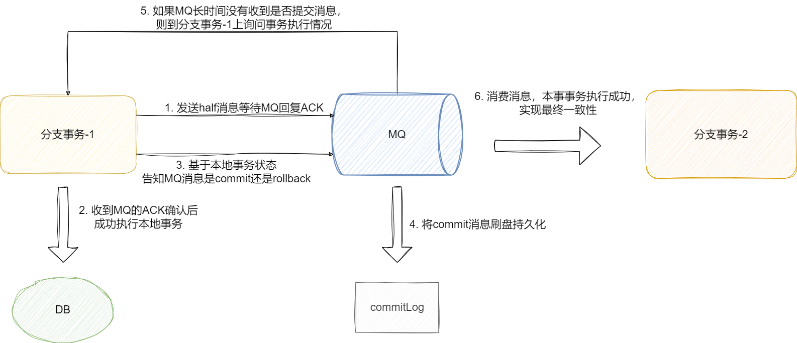 - 针对问题2,即使commit消息丢失,分支事务也提供回查接口告知本地事务状态,让MQ将half消息发送出去。