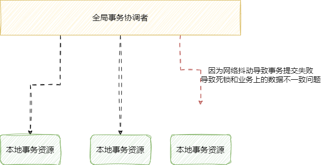 同时,2PC在二阶段若因为网络抖动等某些原因,可能会导致某些分支事务无法被提交而导致数据长时间被锁定,导致业务夯住,进而还会导致一些数据不一致的问题: