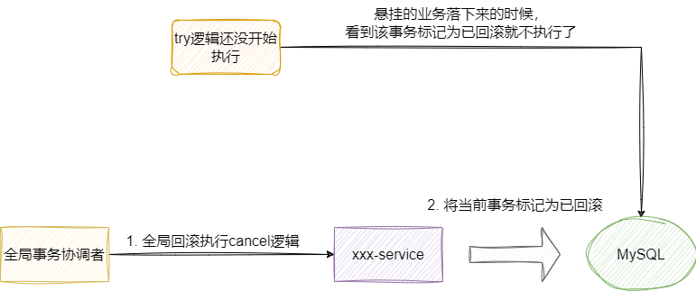 有了这张表,遇到空回滚时我们也能够记录当前回滚状态标识回滚,后续即使出现悬挂的try逻辑也能基于此表感知到回滚则不执行: