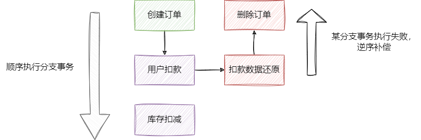 - 顺序执行过程中,如果某个事务执行失败,则基于这个事务往回走反向执行补偿方法将数据回滚: