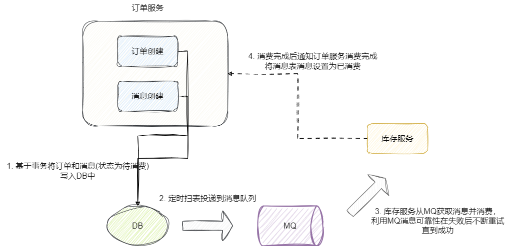 - 订单服务基于本地数据库原子性将订单信息和消息(状态为待消费)写入到本地数据库中。