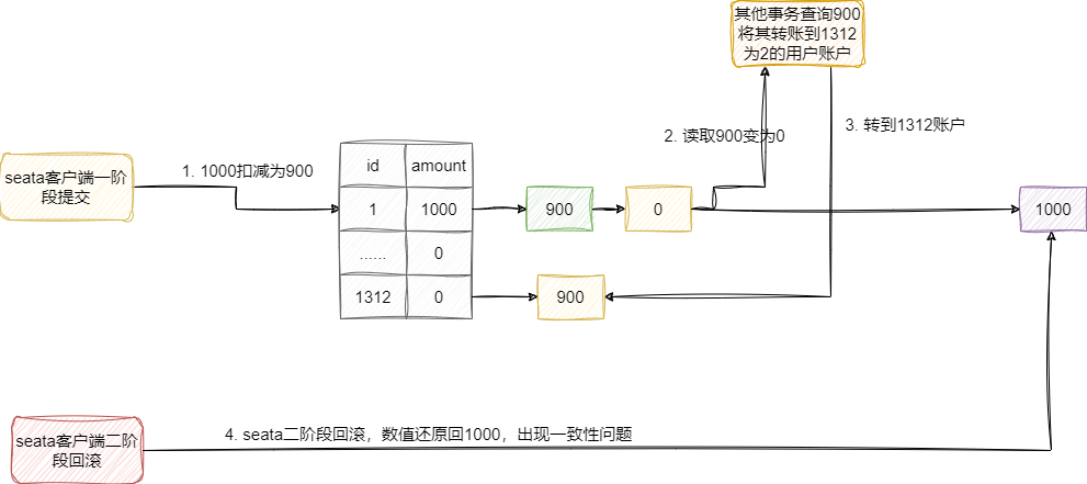 假如一阶段库存服务完成一阶段事务准备,此时我们其他非seata管控的事务查到的用户余额由1000变为900,假设此时我们的业务需要基于这个数值进行全额转账执行的操作是:
