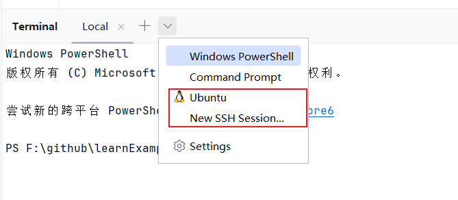 新版本的IDEA支持直接在terminal上连接WSL和配置SSH远程连接,我们只需点击终端旁边的箭头即可进行配置了: