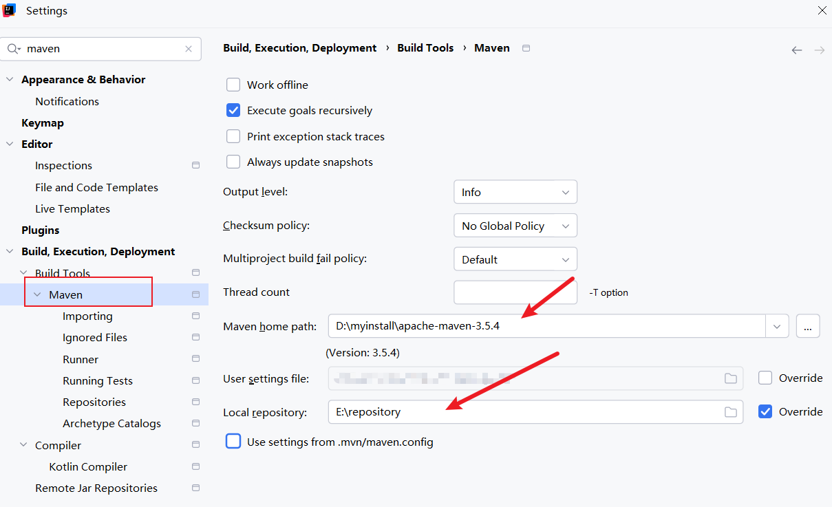 如下图,将对应maven home和配置文件设置为自己的版本和路径即可: