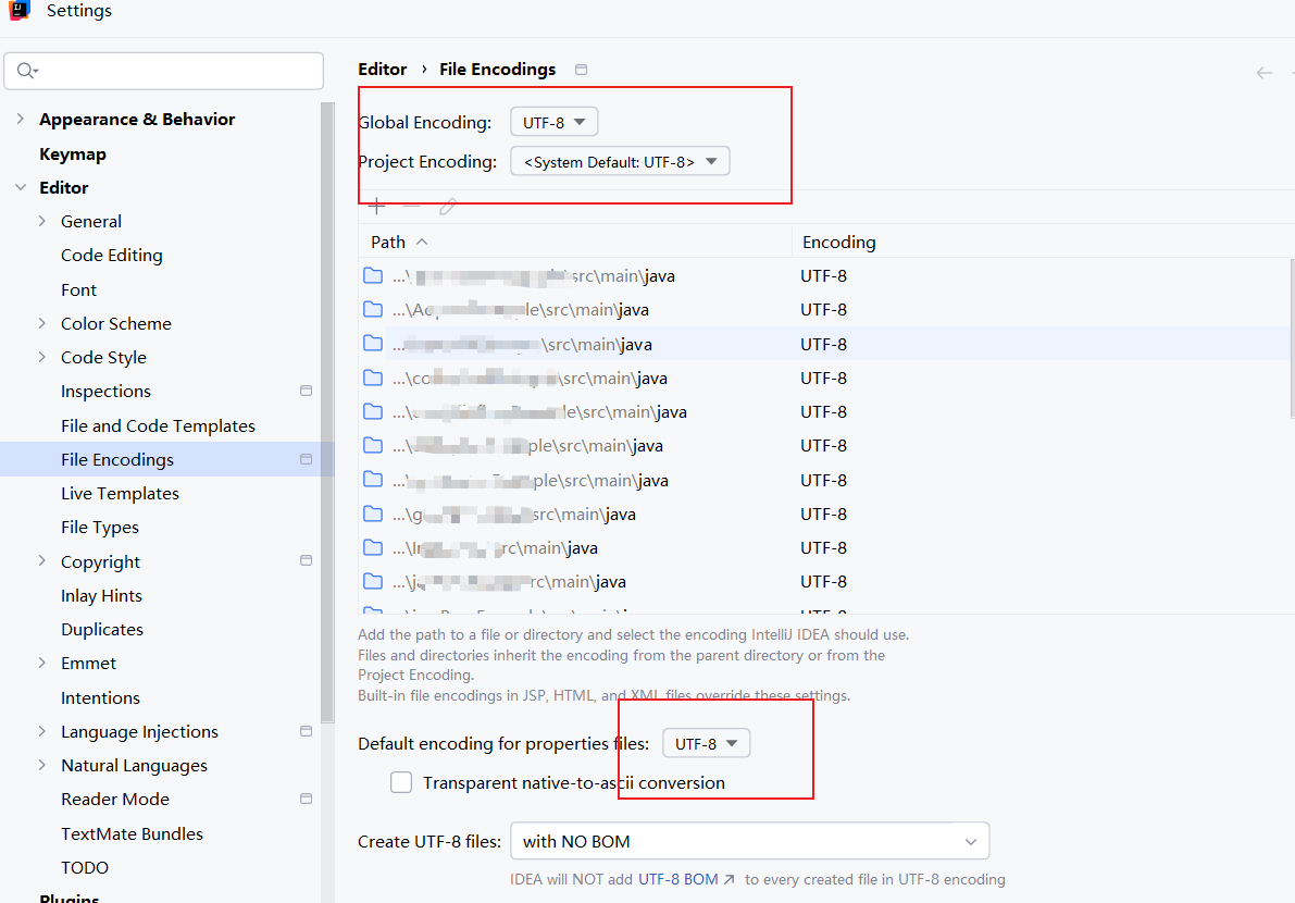 再通过File | Settings | Editor | File Encodings将全局编码格式统一设置为UTF8,这样一来后续的项目就统一采用UTF8格式打开编码了: