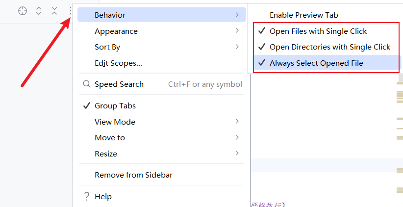 初始情况下,我们打开IDEA点击Tab栏上的文件,左侧是不会跟随打开的,所以我们可以找到侧边栏的behavior设置勾选下述三个选项确保文件点击跟随