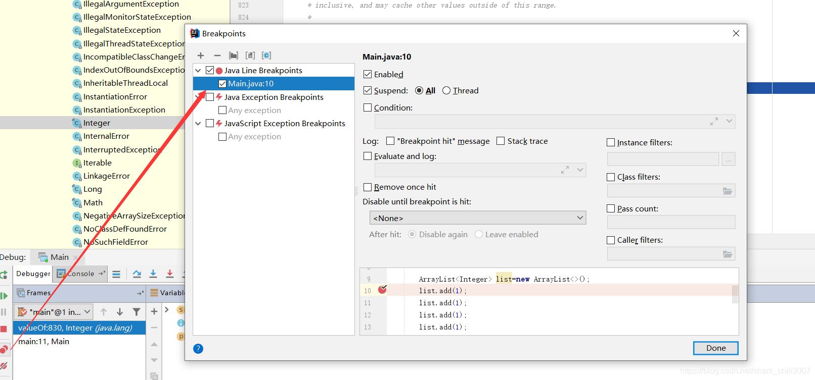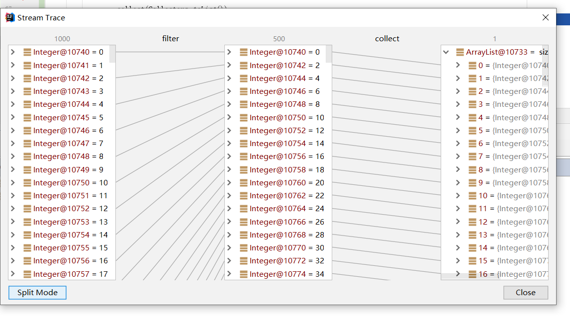 如下代码,我们日常为了方便调试,在配置IDEA的时候可能会放行所有java.*的源码包,这使得我们在调试流操作时可能就会步入繁杂的流式转换的源码中: