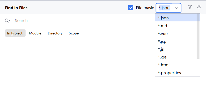 完成后我们将IDEA重启,此时我们的全局搜索CTRL+shift+F就可以按照格式文件后缀进行过滤了: