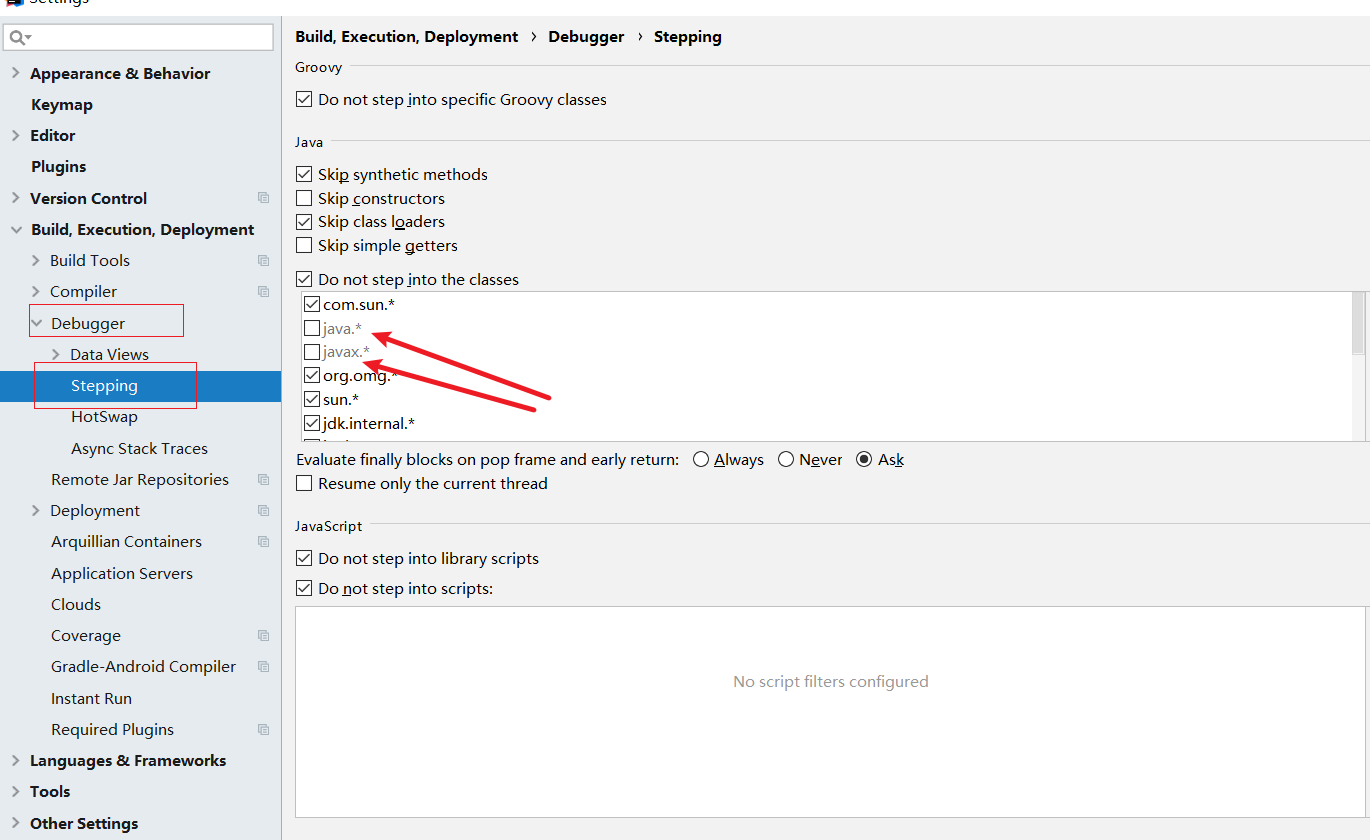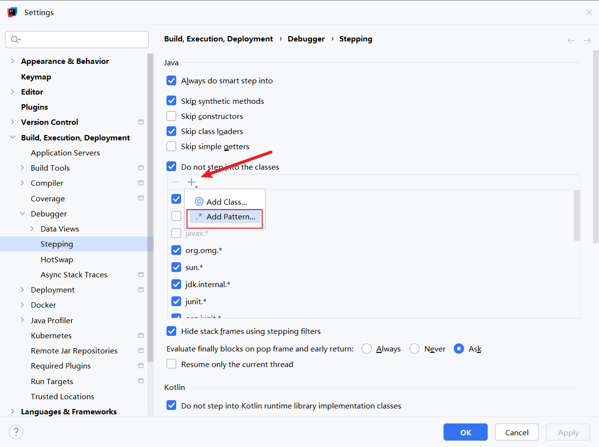 所以我们可以通过File | Settings | Build, Execution, Deployment | Debugger | Stepping找到断点步进调试配置,点击+号添加配置选择ADD Pattern添加调试时不步进的源码包: