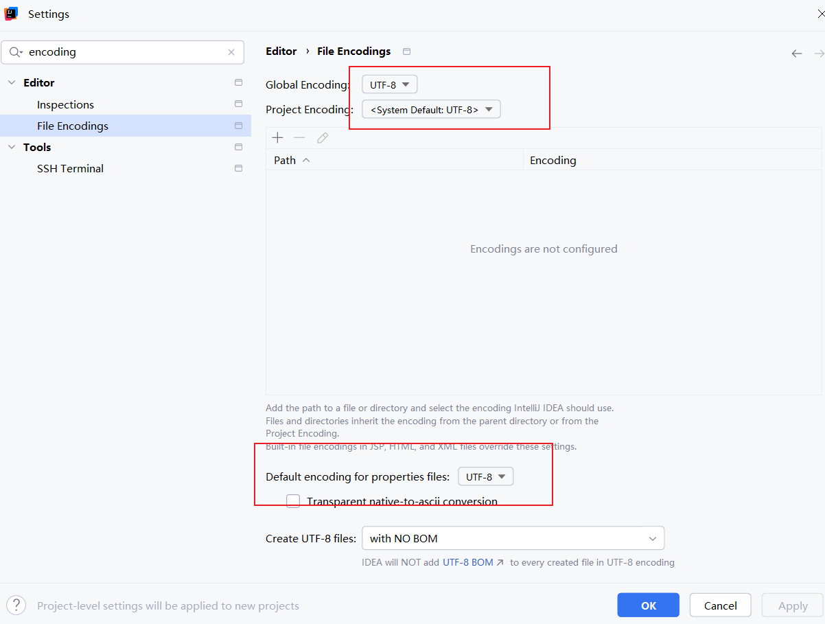 24版本默认编码会跟随系统走,所以我们每次初始化项目时,需要记得随手修改编码格式,通过File | Settings | Editor | File Encodings找到编码选项即可完成配置: