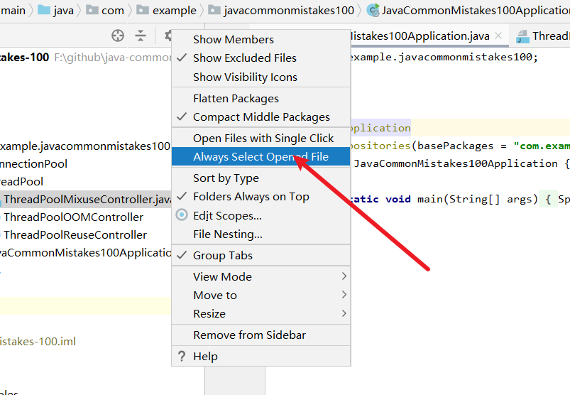 如果希望点击tab栏上的一个文件时,左侧的项目文件结构会跟随移动,我们可以勾选下图所示的选项: