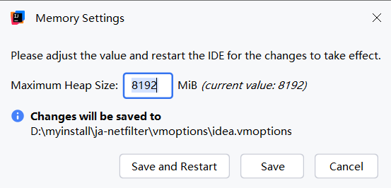 以笔者为例,直接设置最大堆内存为8G,完成后选择save或者save and restart使之生效即可: