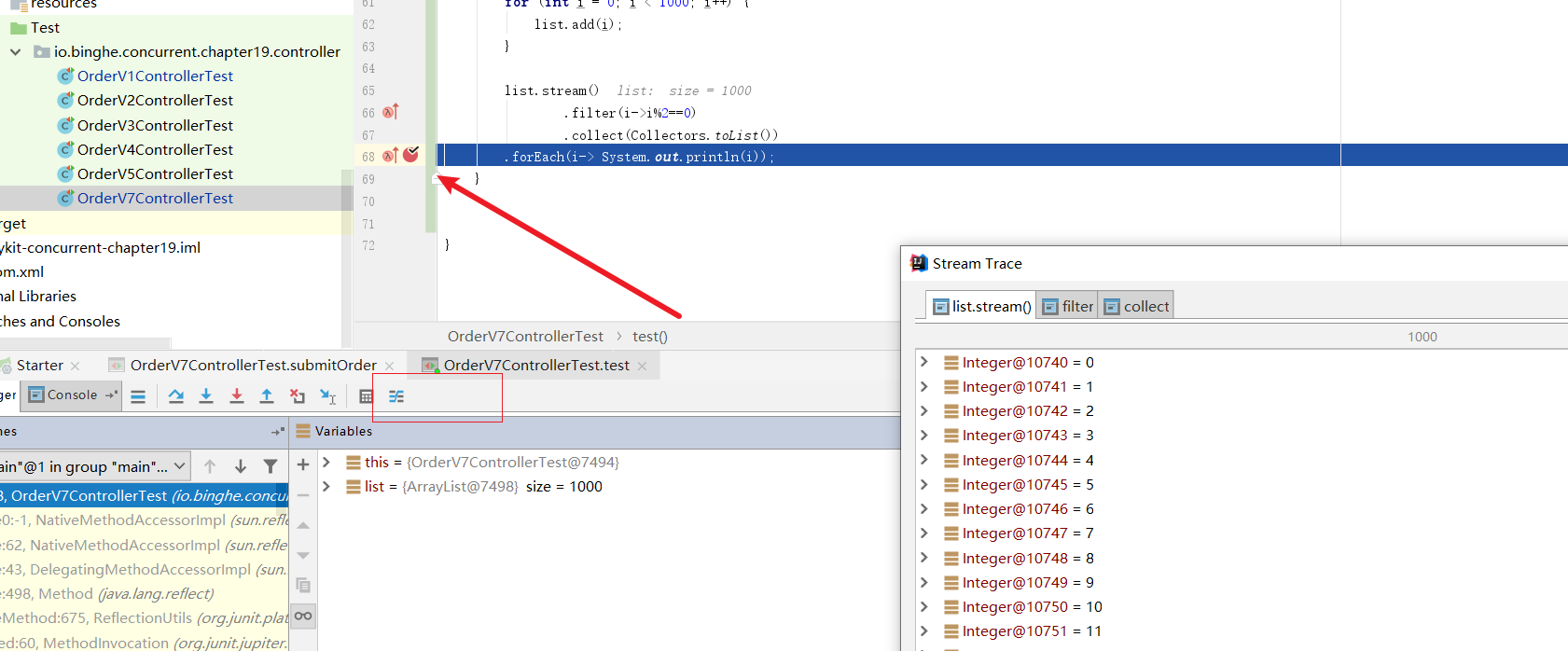 例如我们在上述代码的map映射流操作中打了个断点,调试时就会不断在stream包下游走,影响调试的效率: