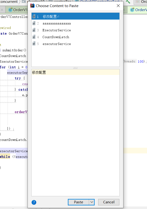 在IDEA强大的支持下,我们完全可以通过ctrl+shift+v,找到自己的复制历史,如下图所示,例如我们想复制修改配置这个文本,只需键盘键入1即可: