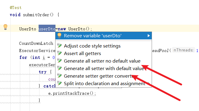 安装完成并重启IDEA后,对着需要进行set的对象键入alt+enter即可根据需要完成set,以笔者为例,我们要设置默认值,所以我们就选择with default value选项,当然这也是笔者早期的一些配置,在ai编程的时代下这些操作基本上都是AI辅助生成: