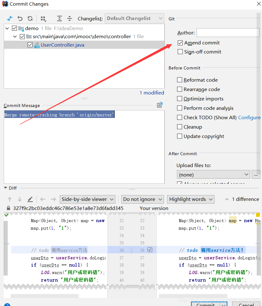 有时候我们上次提交会遗漏一些东西,我们可以勾选图中的选项,提交代码即可对上次提交做追加 (注:这个操作仅对未push到远程仓库的提交有效)