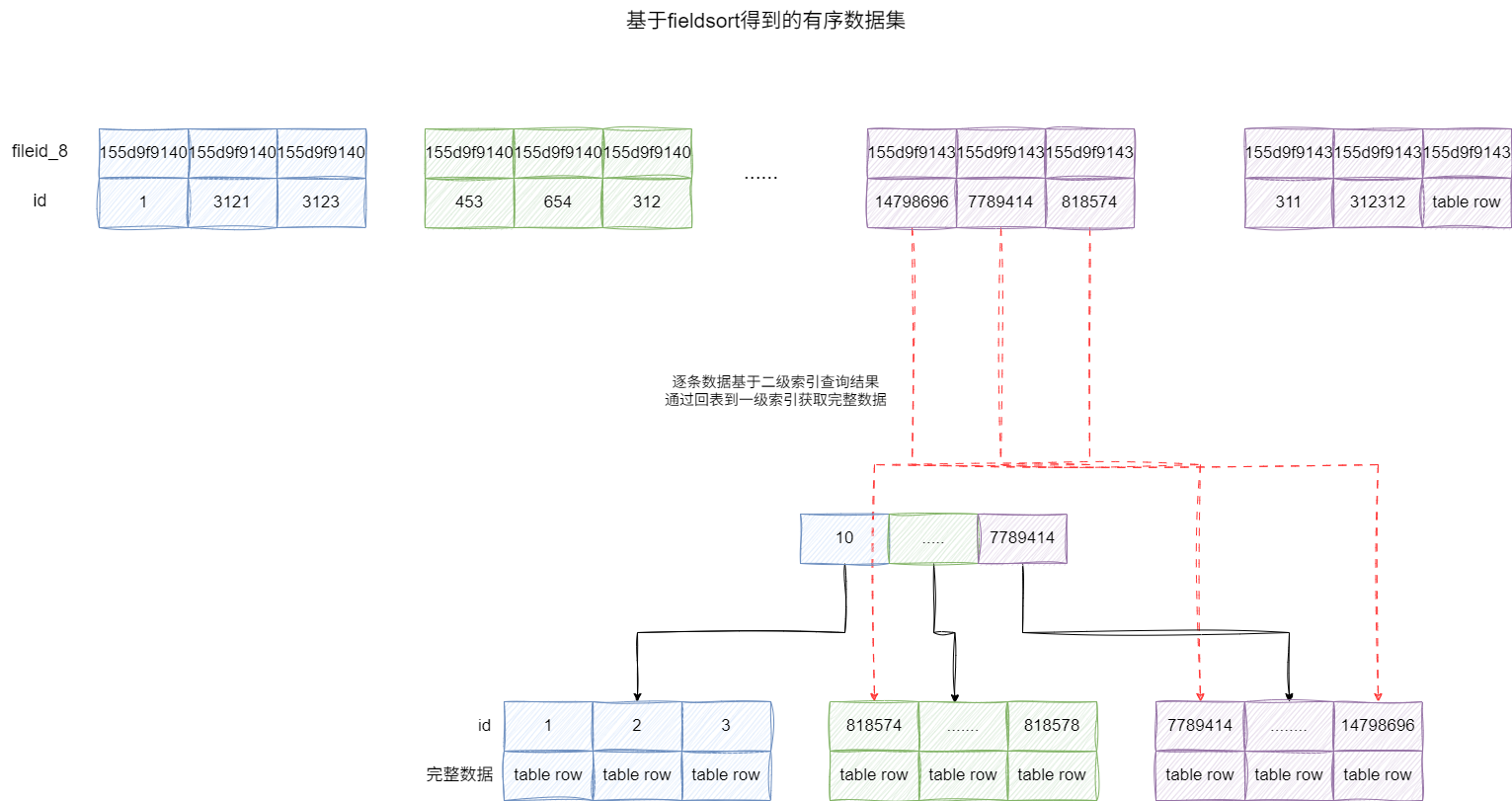 因为我们基于fileid_8创建了二级索引,所以我们可以借助MySQL中索引覆盖的特性,在排序时通过扫描二级索引定位到主键索引区间,并基于这个主键区间一次性到聚簇索引树上获取所有数据,避免多次回表的开销。