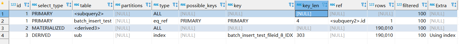 1|SIMPLE |batch_insert_test| |index| |batch_insert_test_fileid_8_IDX|303 | |190010| 100.0| |