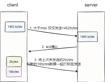 如下图所示,我们客户端要发送1462字节数据,大于mss所以拆出1460字节发送,按照Nagle算法,只有收到ACK或者超时在进行发送,所以在没收到ACK且没超时期间,客户端又攒了18bytes的数据,服务端发送ACK确认之后,客户端再将20bytes数据一次性发送出去,由此避免了一些没必要的流量消耗: