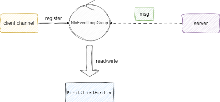 我们希望实现一个高性能事件驱动的客户端,因为客户端无需处理新连接接入,所以我们只需要一个EventLoopGroup即可,这里笔者选择NioEventLoopGroup毕竟Netty强大就体现在NIO,所以我们就没有设置为BIO。然后添加对应的客户端读写处理器ClientHandler处理当前客户端channel轮询到的读写事件即可: